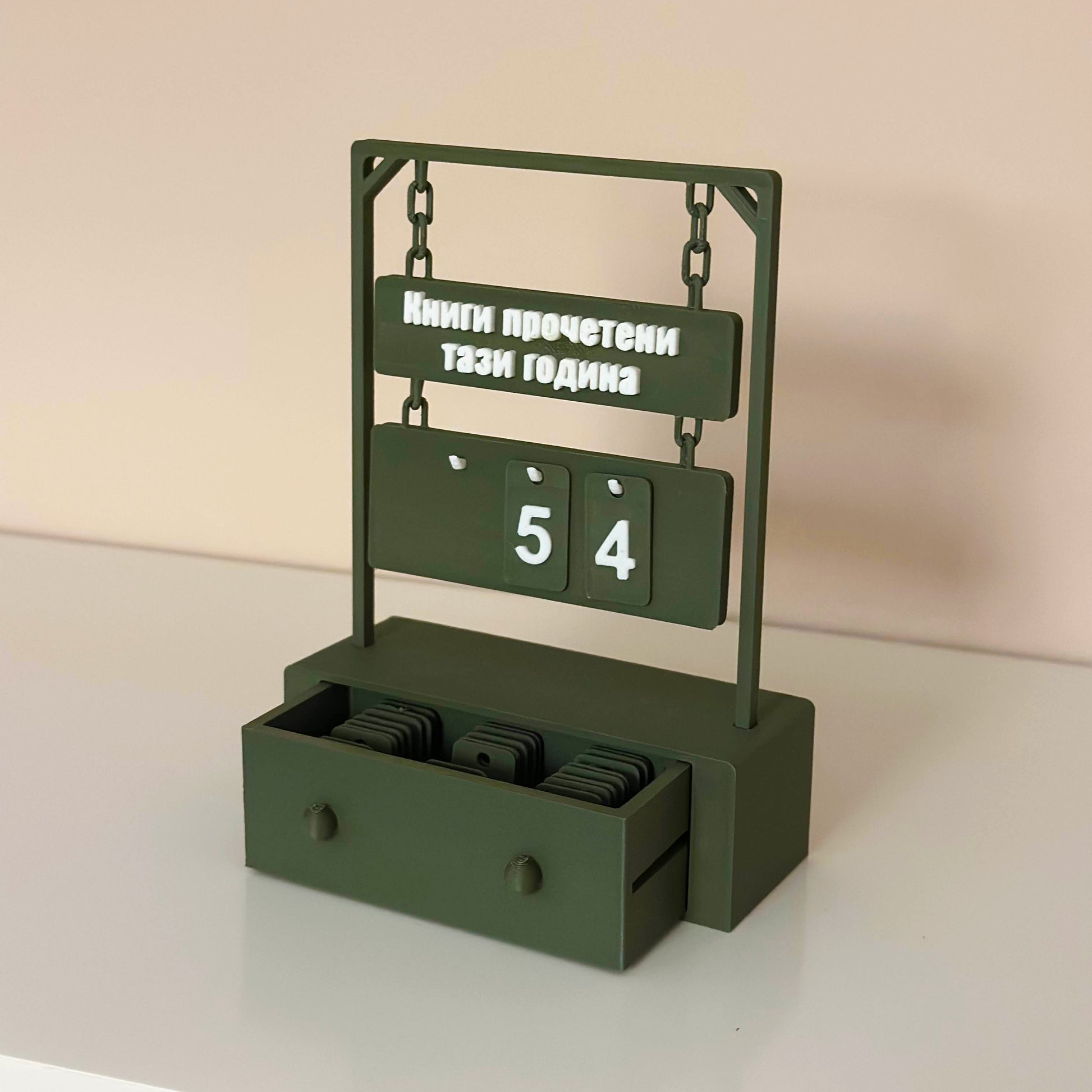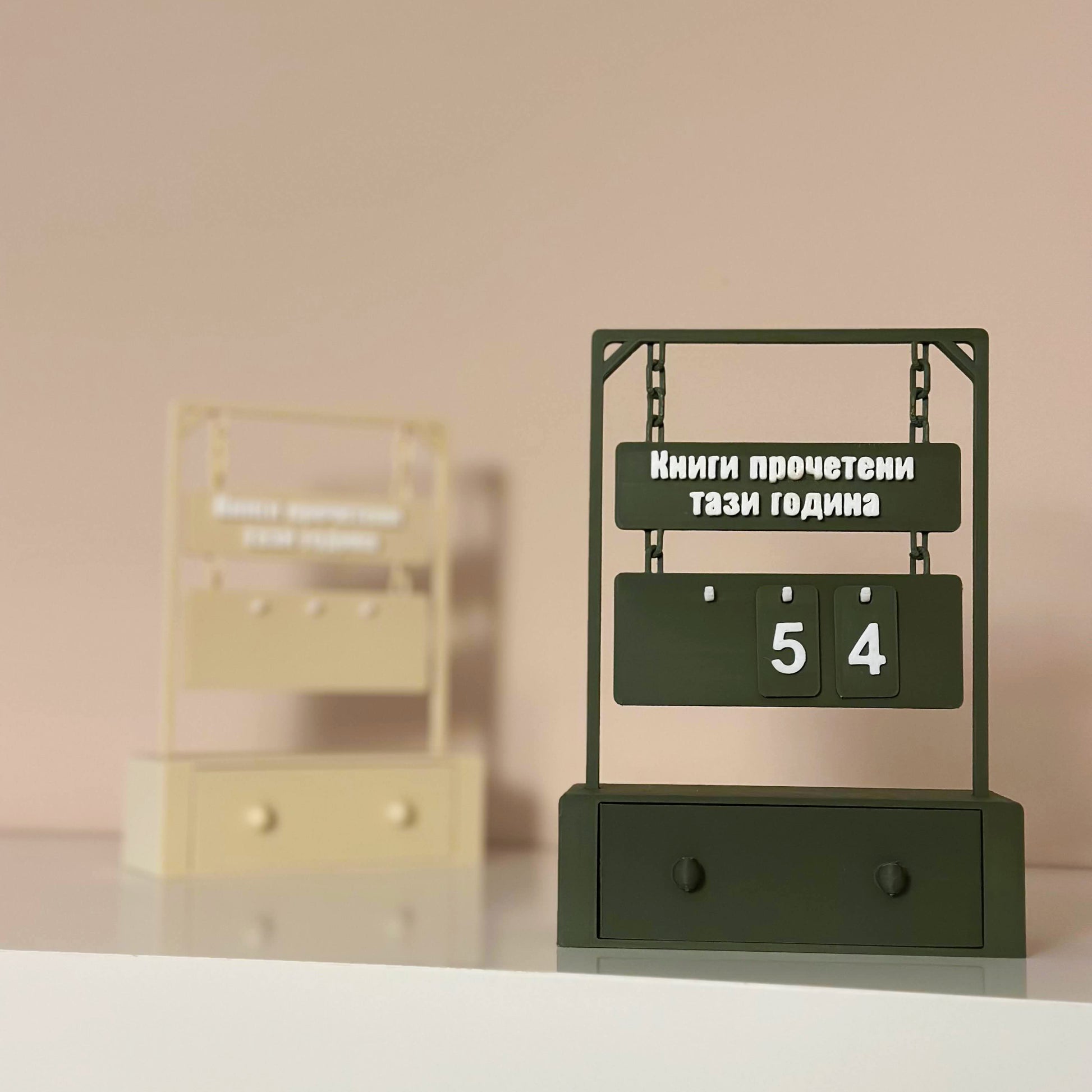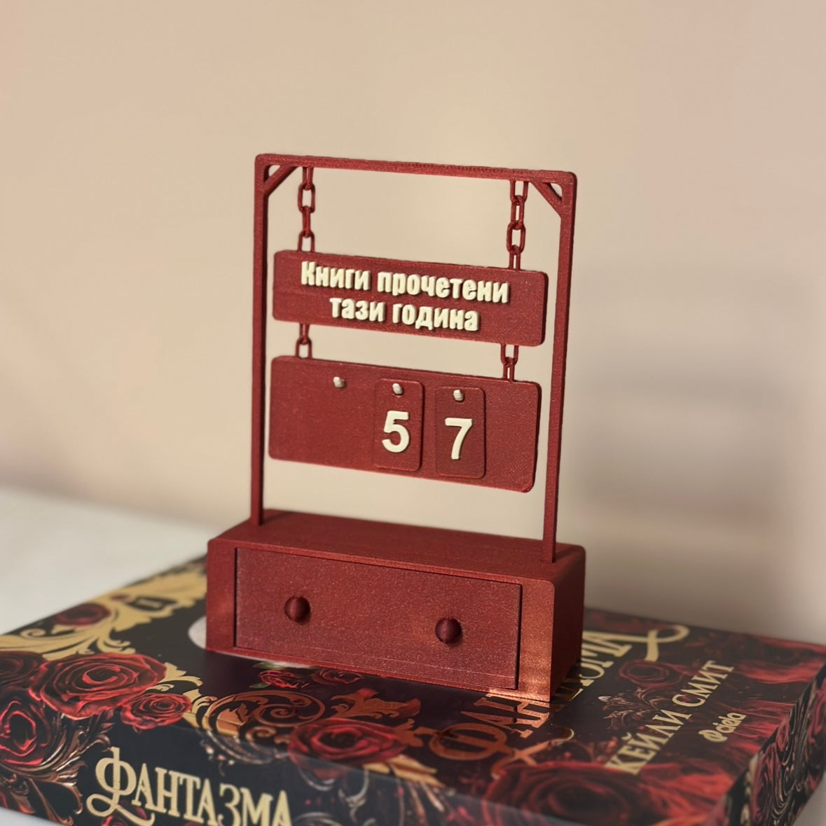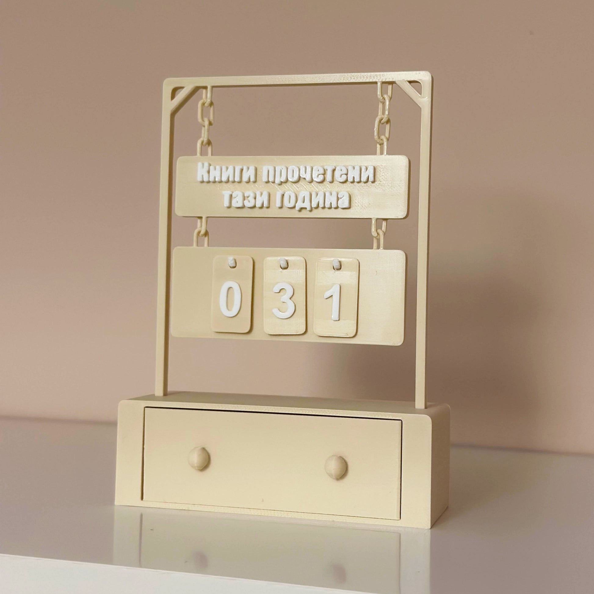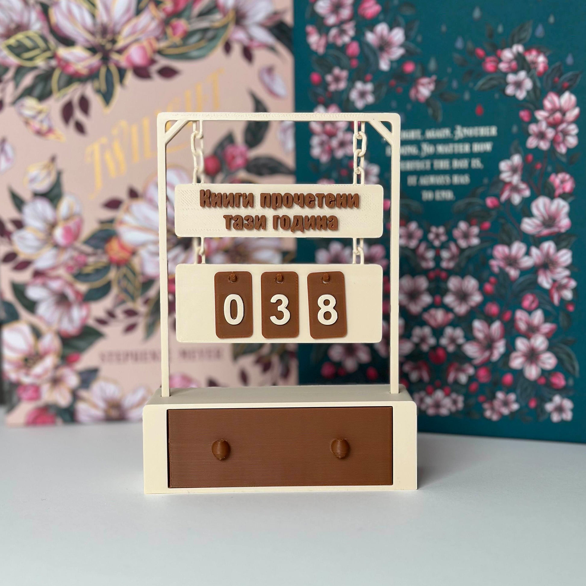Стилна и практична декорация за любителите на книги. Тази функция ви позволява да записвате колко книги сте прочели през годината, като променяте числата от 000 до 999. Забавен и мотивиращ начин да следите напредъка си в четенето, като същевременно добавяте чар към вашата библиотека или бюро.
